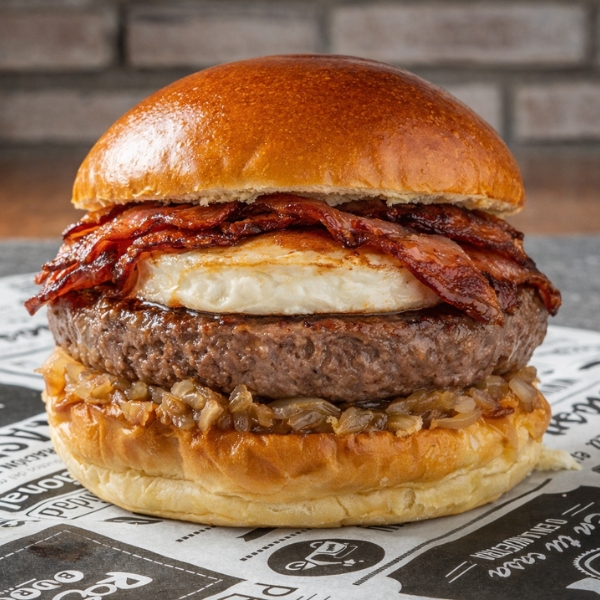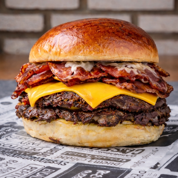 Doble SMASH Angus, queso cheddar, cebolla caramelizada, bacon, mostaza, mayonesa.