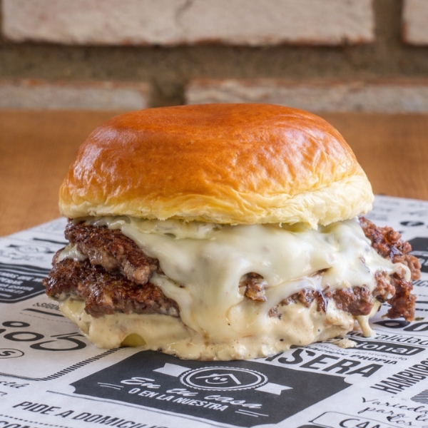 Pan Brioche, Doble Smash Angus, queso y nuestra deliciosa salsa de pepinillos.