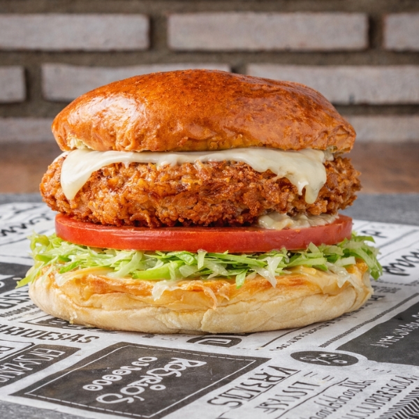 Crujiente Rebozado, tierna y jugosa por dentro, con lechuga, tomate, mayonesa.