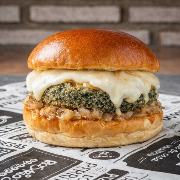 Hamburguesa de espinacas, cebolla caramelizada, queso, salsa de soja, mayonesa.
