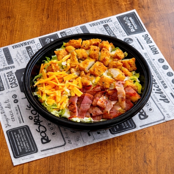 Lechuga fresca con pollo crujiente, bacon crujiente, queso cheddar y salsa.