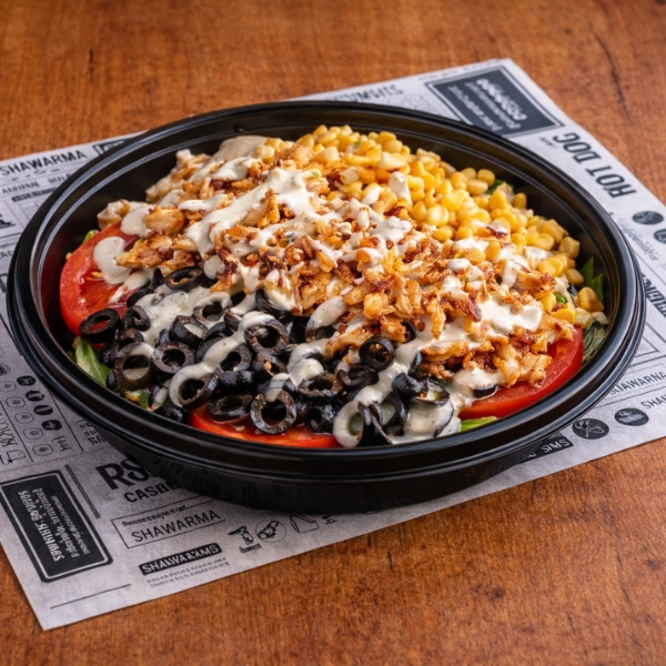 Carne de showarma, lechuga, tomate, cebolla, maíz, aceitunas negras, salsa de yogurt.