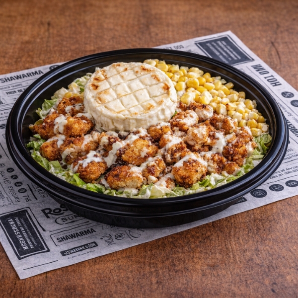 Lechuga, maíz, queso de cabra, salsa yogurt, pollo crujiente.
